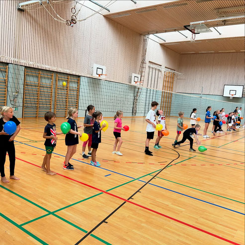 Mit Luftballons, Tennisbällen, Handtüchern, verschiedenen Volleybällen, Hütchen und vielen anderen Materialien konnten die jungen Talente Volleyball auf eine kreative und spielerische Weise kennenlernen. Unsere Trainerinnen und aktiven Jugendspielerinnen waren begeistert vom Engagement und Eifer der Kinder.